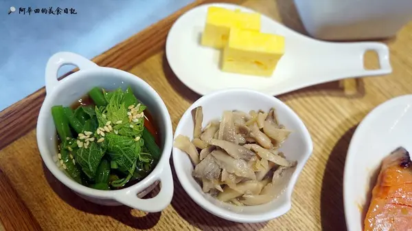 ▲定食的配菜還有這三樣,每日都會有不太一樣的配菜,玉子燒為固定的,玉子燒口感滑嫩,另外兩個漬物,綠色的是和風龍鬚菜,蠻清淡的,另一個則是麻油杏鮑菇,麻油味超重的