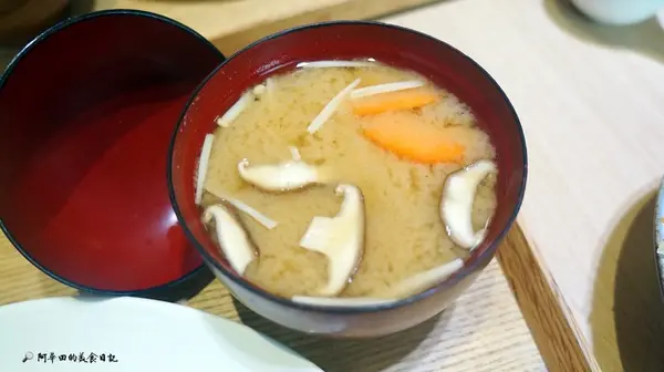 ▲定食附的味噌湯用料豐富,裡頭有紅蘿蔔、香菇、蛤蜊、金針菇還有豆腐,友人說味噌湯太鹹,但我個人覺得剛剛好,不至於死鹹~