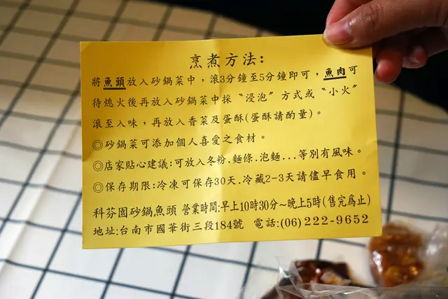 科芬園很貼心,還放入烹煮方法,讓我們把食材帶回家,還能吃到剛剛好的美味度。科芬園的砂鍋魚頭份量可以客製化,砂鍋魚頭(半顆)小份2~4人:$250、大份4~6人:480。