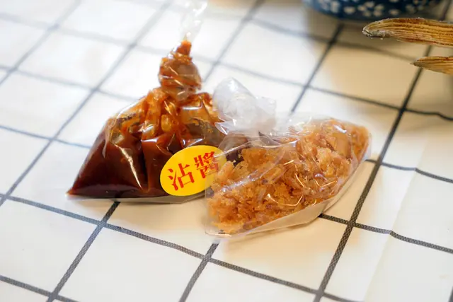 ▼店家還有貼心附上沾醬與蛋酥,增加食材美味層次。