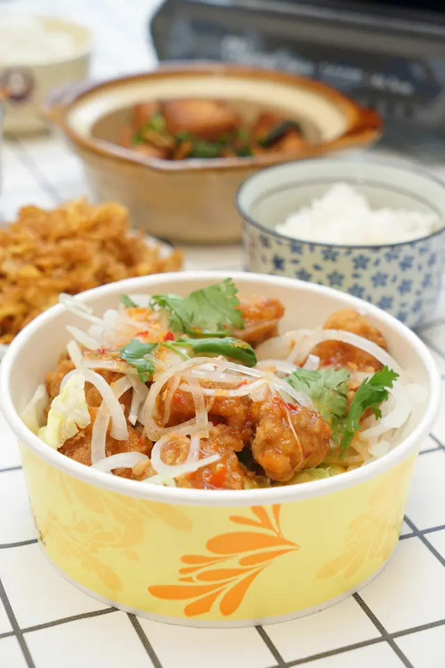 口感酸甜,加上清爽的洋蔥做提味,雞肉炸的外酥內嫩,每一口都有肉汁交雜的香氣,香氣逼人~