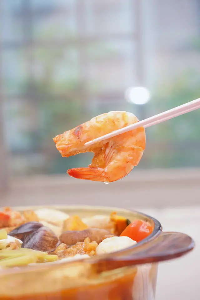 ▼砂鍋魚頭的配菜與配料滿滿,海鮮給的完全不手軟,滿滿站一排的鮮蝦,又大又鮮的干貝。