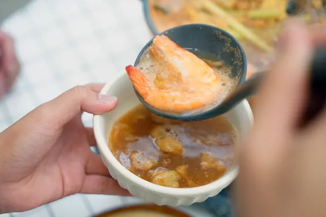 ▼倒入香橙的湯底,湯底的部分絕不是普通清湯,是老闆特別熬製的扁魚湯,真材實料,有蝦仁、扁魚等等配料熬煮,口感很夠又濃郁。