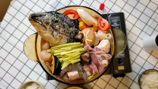 ▼將我們的料都放進鍋內,滿滿的料太多,魚頭只好露出來跟大家見面XD