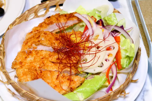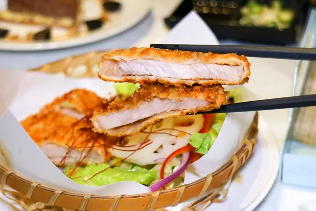 外皮炸得金黃酥脆,內層豬排彈潤中帶有嚼勁,不沾醬搭配蔬菜一起吃格外清爽
