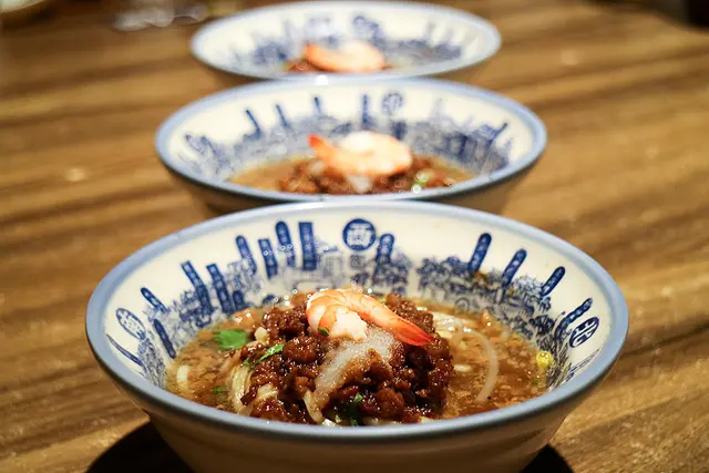 擔仔麵最經典的地方就是麵上面會有一隻蝦仁,以祖傳肉燥與蝦湯等調味,甜蝦頭熬成的高湯,佐以沒有肥肉的肉燥、蒜泥、烏醋香氣濃郁,記得留下最後一口湯,把麵吃完再喝湯,同時再回味一次整碗麵的精華過程,是最完美的Ending,連麵碗都很有特色,不妨一邊吃麵一邊仔細尋找一下玄機在哪兒