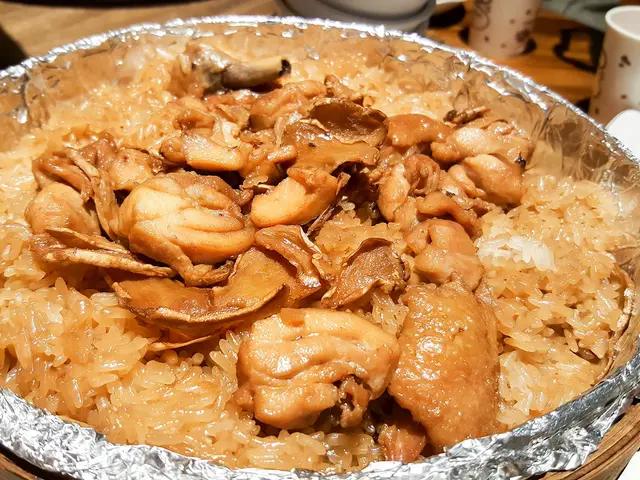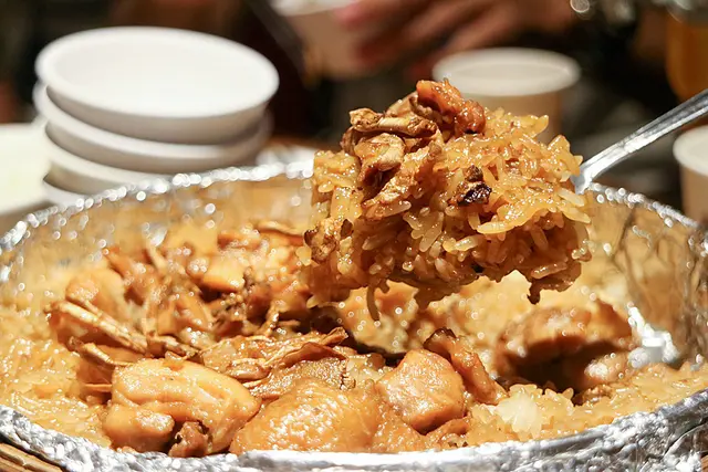 度小月手工自製,以台南傳統口味用正老麻油下去炒,再放入老薑片提香,米糕又Q又彈,放山雞的雞肉口感紮實不鬆散