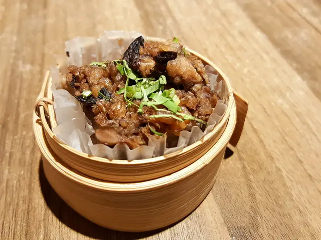 用小蒸籠裝的芋粿,小巧精緻,使用純芋泥跟芋頭絲製作,口感很綿密,上面鋪了一層肉燥, 更豐富了口感層次