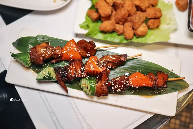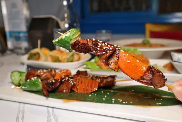 日式燒烤串 - 串燒上有菇類、紅蘿蔔、小黃瓜,不僅香氣十足,蔬食的搭配也很均衡。