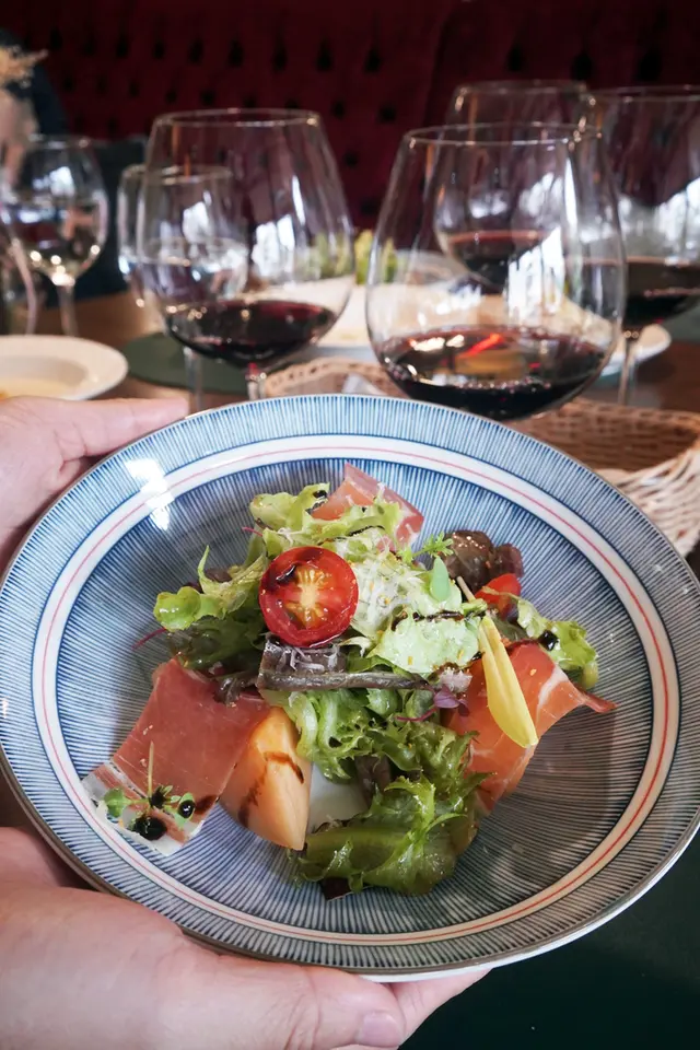經典的沙拉組合,因為義大利風乾帕瑪火腿鹹度很高,所以也會搭配甜度高的水果,將味道綜合