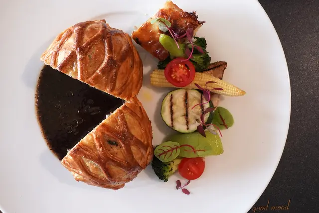 ▼朋友說暖心時光的威靈頓牛排做法非常道地,最外層是主廚自製的酥皮,香酥而脆薄;再來是甘甜微鹹的片火腿、多種蕈菇碎丁和松露炒製的蕈菇醬,增添風味;中間是味濃綿密的鴨肝;最後是鮮嫩、入口即化的菲力牛排。