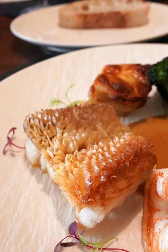 魚鱗一層層高高豎立,有如花綻放,不光是華美外觀,酥脆魚鱗和甜嫩魚肉呈鮮明對比,雙重口感在嘴裡碰撞,彷彿在舌尖跳華爾滋