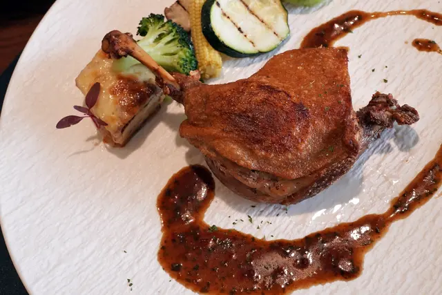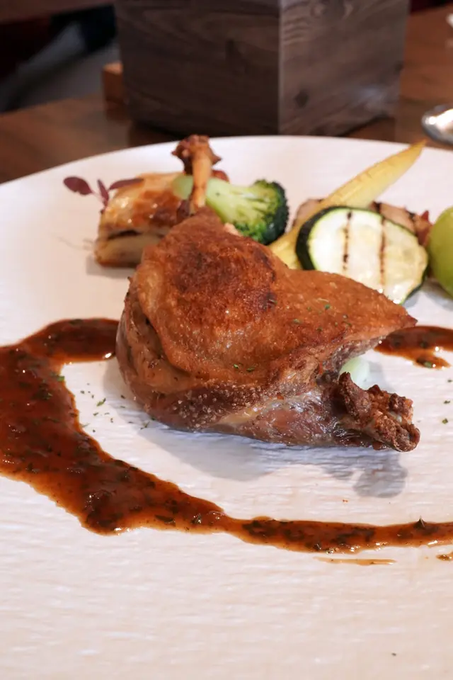 以80度低溫,用鴨腿本身的鴨油,花上8~9小時慢慢熟成。別看外皮酥脆,其實鴨腿非常好撕咬,而且乍看鴨腿小隻,但它是運動有素的鴨腿,肉質很厚實、很有彈性