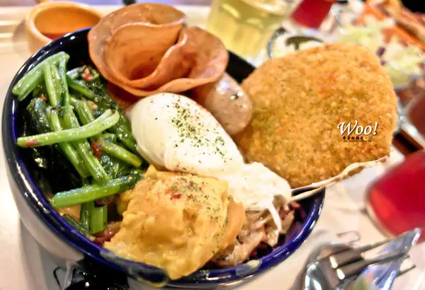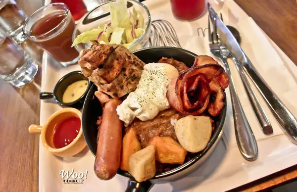 主食有薯塊、 生菜、培根、德式香腸、香煎嫩雞