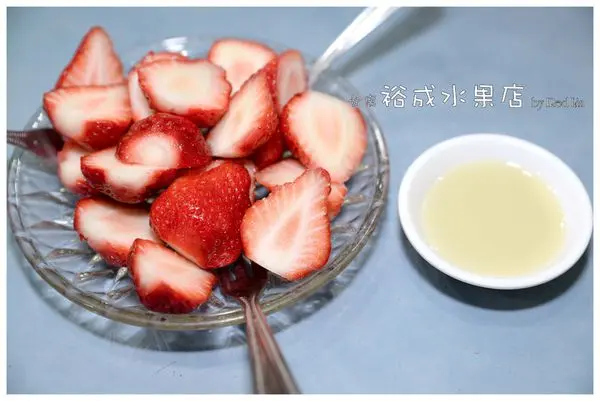 草莓相當乾淨,連蒂頭也處理得很好,切成一半看起來就好吃樣。而草莓的好朋友煉乳當然不可以缺少囉!不過這草莓真的好吃,甜美之外帶些草莓該有的微酸感,搭配香濃的煉乳,正點。