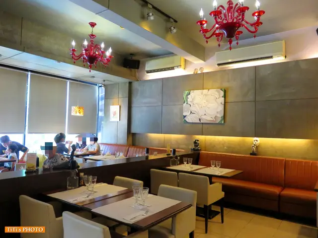 店內給人優雅自在的用餐環境,天花板的紅色仿水晶吊燈加上一面靠牆的淺咖啡色皮沙發