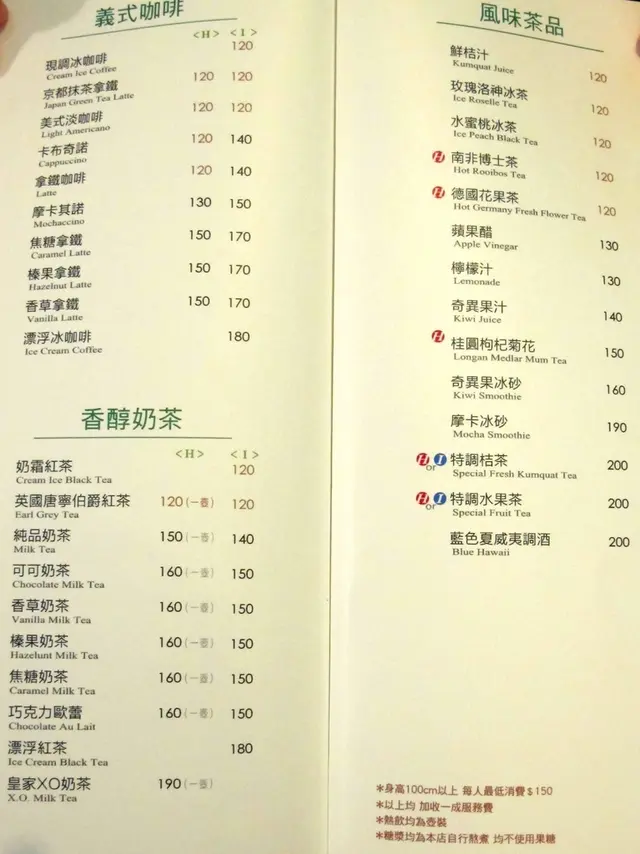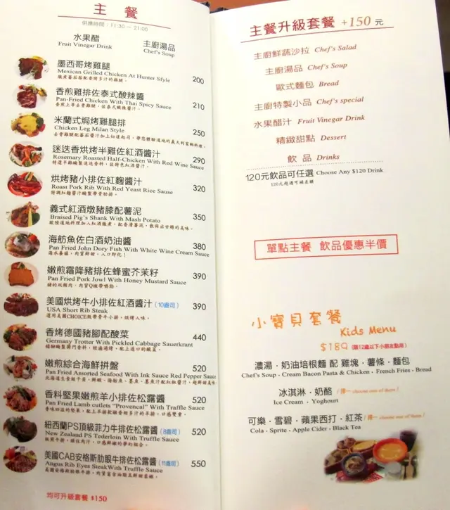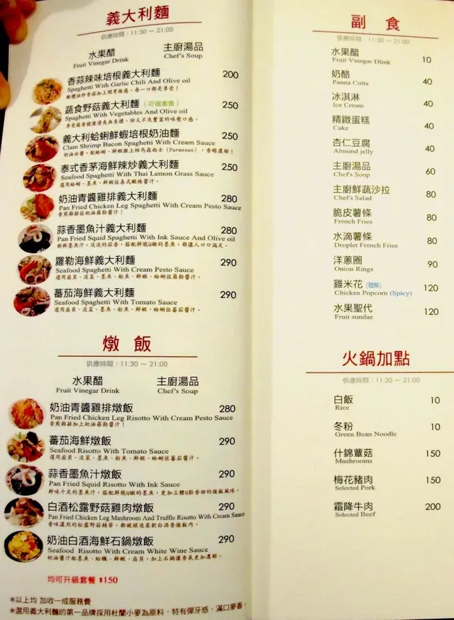 主餐(排餐)、義大利麵、燉飯 均可升級套餐+$150