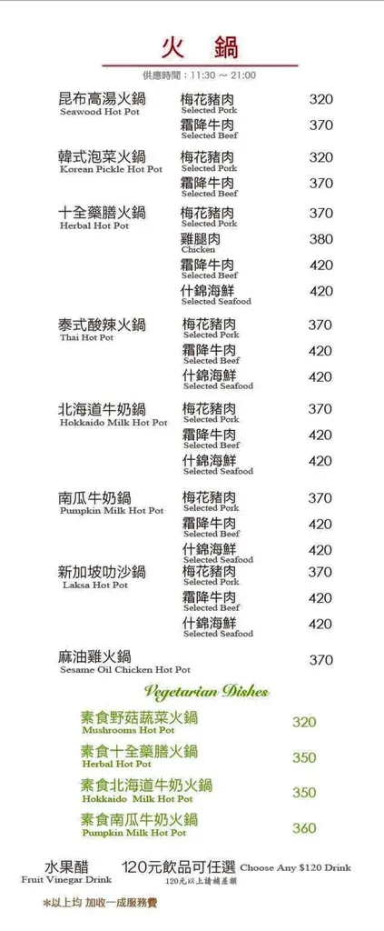 火鍋系列餐點附:水果醋汁、飲品$120任選(超過可補差價)