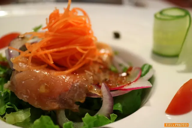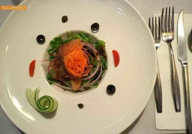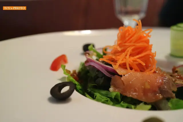 鮮蔬沙拉配上煙燻鮭魚、油醋醬,有小小高級的味覺+視覺享受