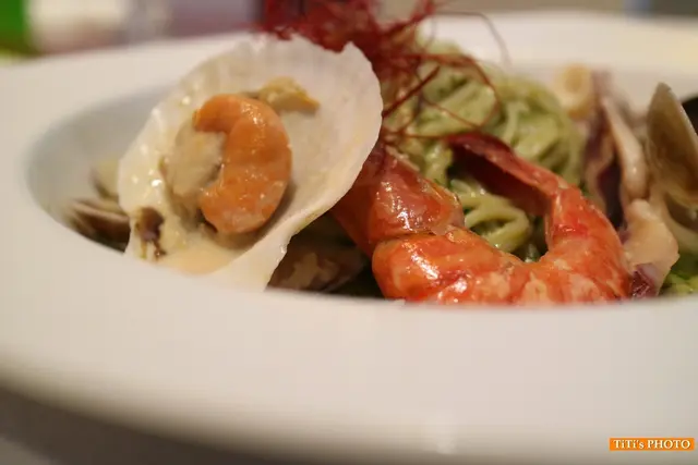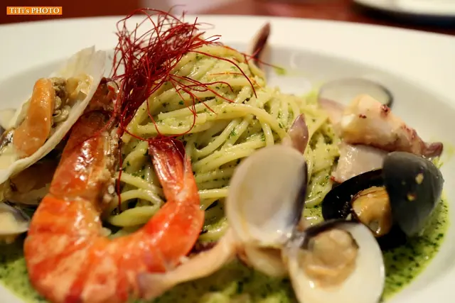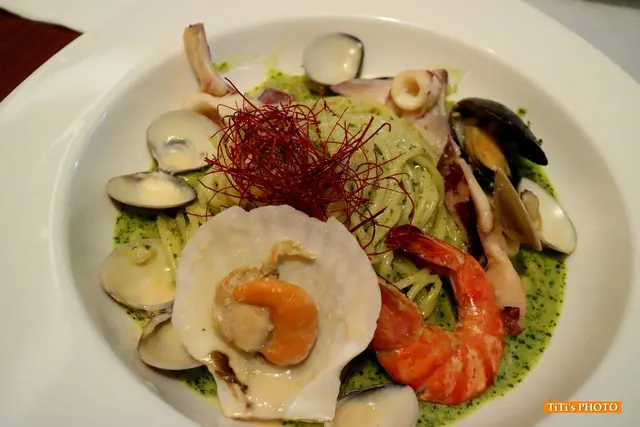 蘿勒義大利麵四周舖滿海鮮,中間放上亮眼紅絲裝飾食材作點綴,簡約大方
