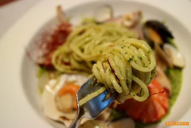 再將原有的醬汁加入蘿勒醬、義大利麵作拌炒讓義大利麵吸飽海鮮精華醬汁,再舖上海鮮