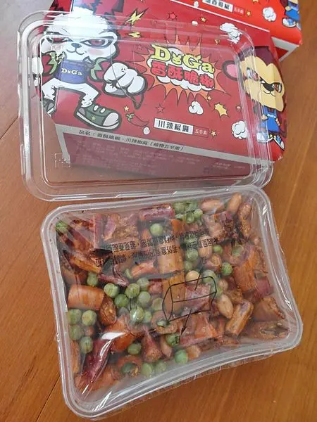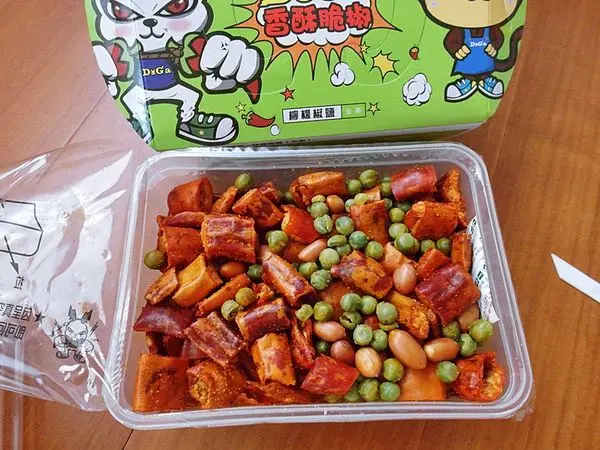 盒子裡裝了滿滿的辣椒餅乾 花生 碗豆