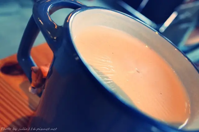現煮的果核功夫奶茶熱騰騰上桌,表面形成一片薄膜是倒拎來著XD