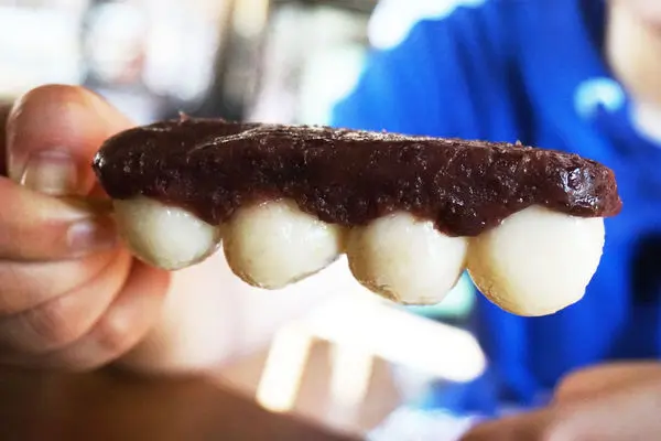 經過烘烤過的糰子,口感嚐起來比紅豆的更Q軟香彈些