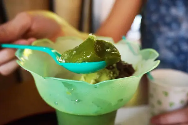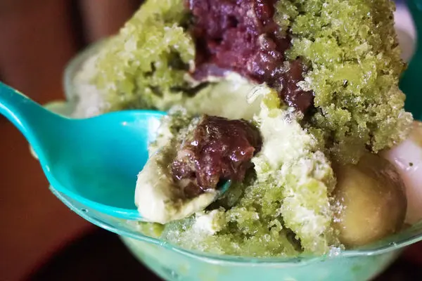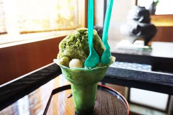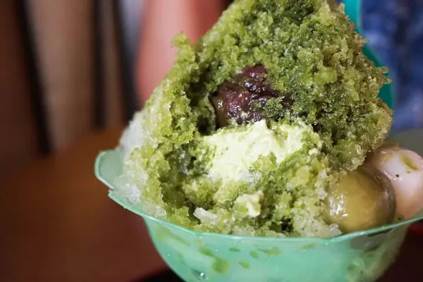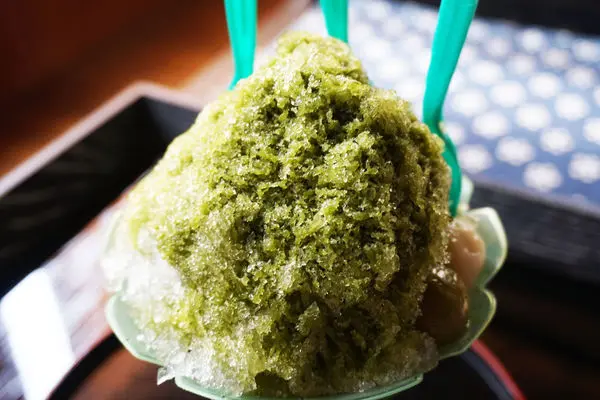 上方刨冰淋上抹茶蜜,在我們眼前呈現出一座沁心透涼的翠綠山丘,讓人看了很是消暑