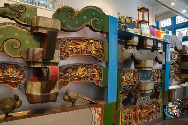 吧台融合廟宇的元素,洋式吊燈、日式木窗,各式各樣的復古擺設等,讓用餐空間多了情感溫度。