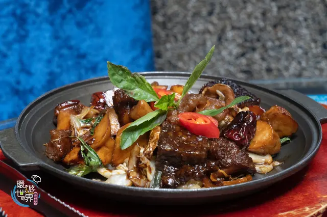 用精靈菇、珊瑚菇、杏鮑菇、蒟蒻用麻油下去熱炒,Q彈口感為其特色,有仿牛筋的相似度。