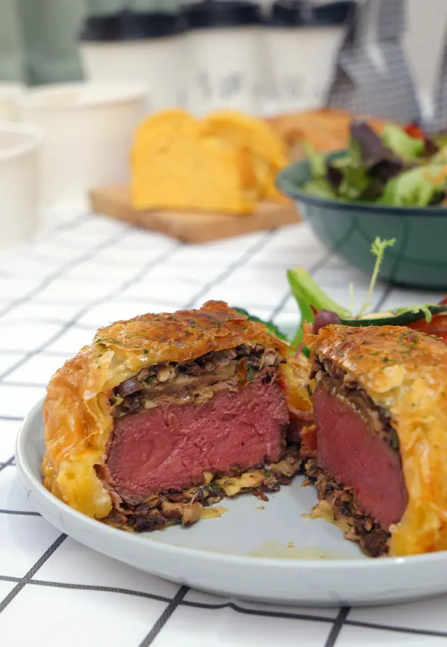 隱藏菜單的威靈頓牛排,是西餐界的經典不敗菜色,頂級菲力牛排外圍裹上蘑菇泥、鴨肝、松露,再用酥皮包覆,外酥內嫩~與配菜的層次搭配,果然名不虛傳。