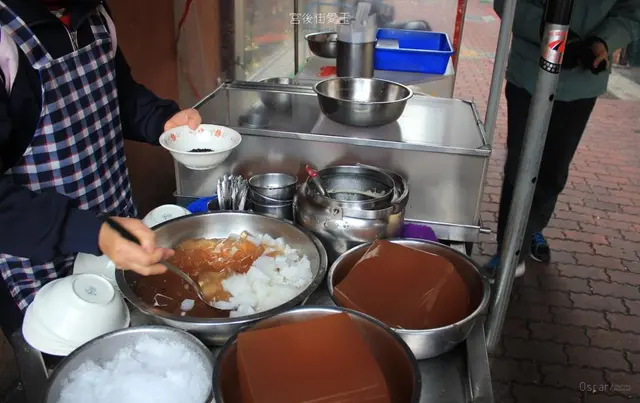 老闆娘以熟練且快速的手勢 將愛玉 杏仁凍 粉圓 以及香甜的糖水相互組合