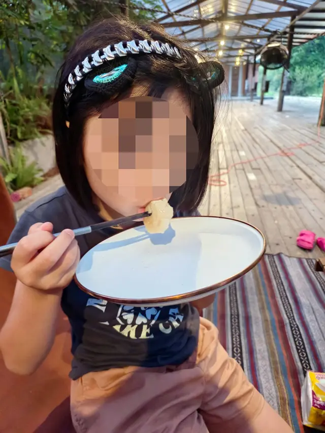 ▼朋友小孩也不顧燙口,插起來就直接上口。不過真不愧是生食級干貝,肉質細膩飽滿,吃起來軟嫩鮮甜,外面微熟,裡面還是生的,咬起來是滿滿的甘美海鮮滋味,食慾一下子又飆升起來了!