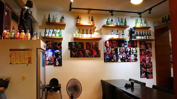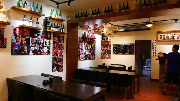 要不是四周的天花板處擺滿日本酒瓶,提醒我這是間居酒屋或是日本料理店,我還真的打算好好地參觀一下全部的劇報和模型XD