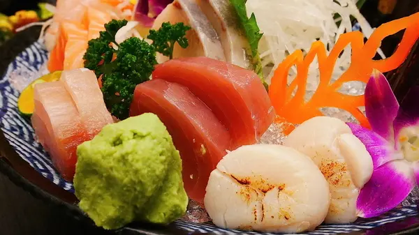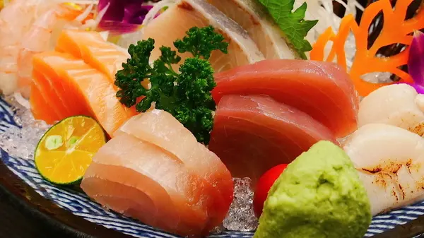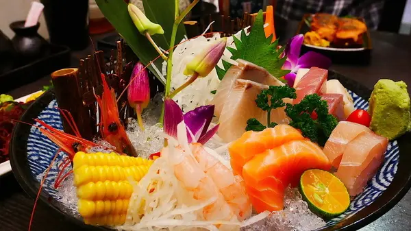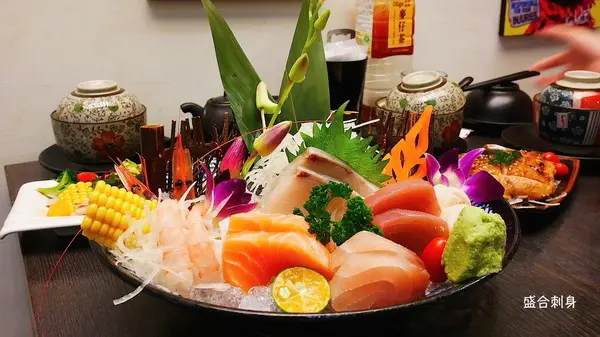 裡面有:鮭魚,鮪魚,旗魚,紅甘,生食級大干貝,甜蝦,甜玉米。