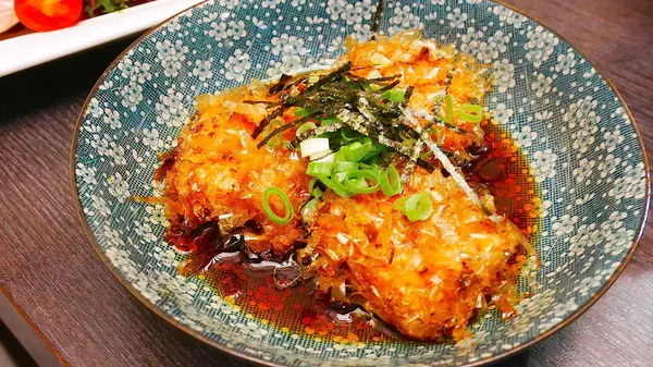雞蛋豆腐厚切,表面裹上厚厚滿滿的柴魚片後入鍋油炸~