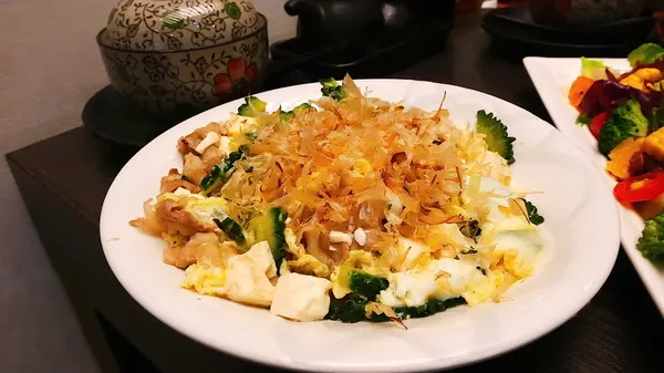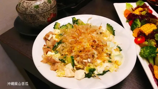 沖繩風味的日式家常菜,大量使用豆腐+雞蛋,和山苦瓜拌炒,還有少許豬肉片,最後再放上大把柴魚點綴。