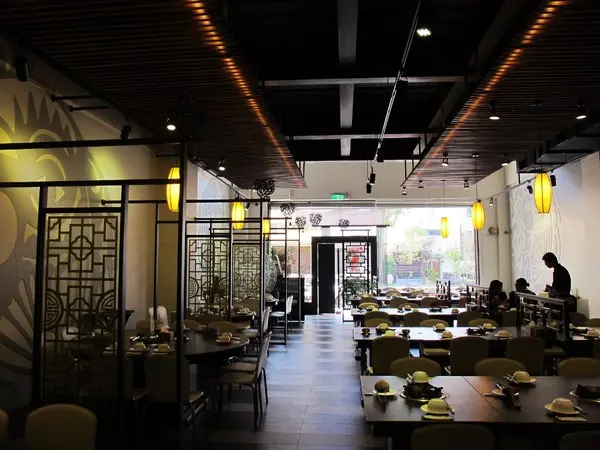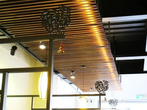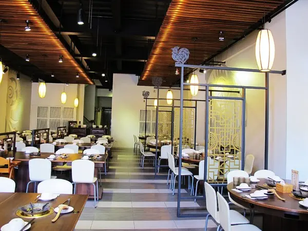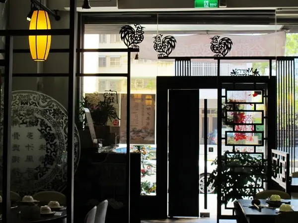 還可以看到每桌間的 復古鏤空雕飾屏風的上方,都有一隻雄糾糾的金屬花雕雞裝飾!