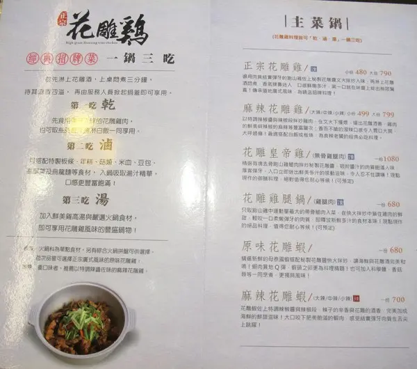 將花雕雞這道菜餚提出與眾不同風味,一鍋可供三吃