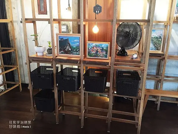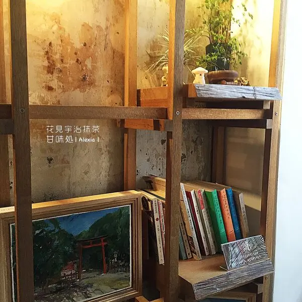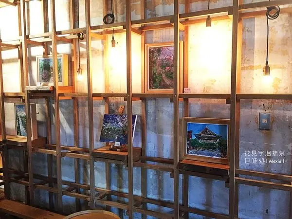 ▲ 木質框架中擺了取多畫作和書,很特別~
