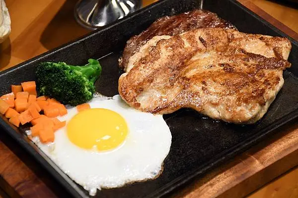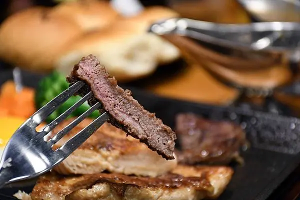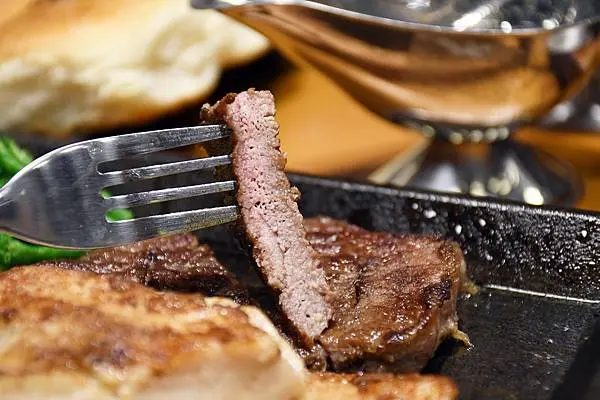 而且你會發現牛排也是非常厚實,外表煎到最佳的熟度,再以鐵盤上桌呈現美味