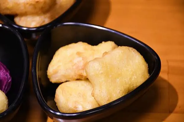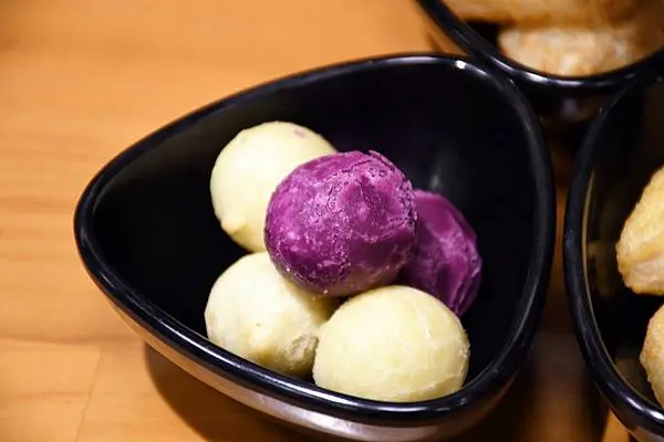 有包餡的地瓜球吃起來彈牙又爆漿,好吃耶