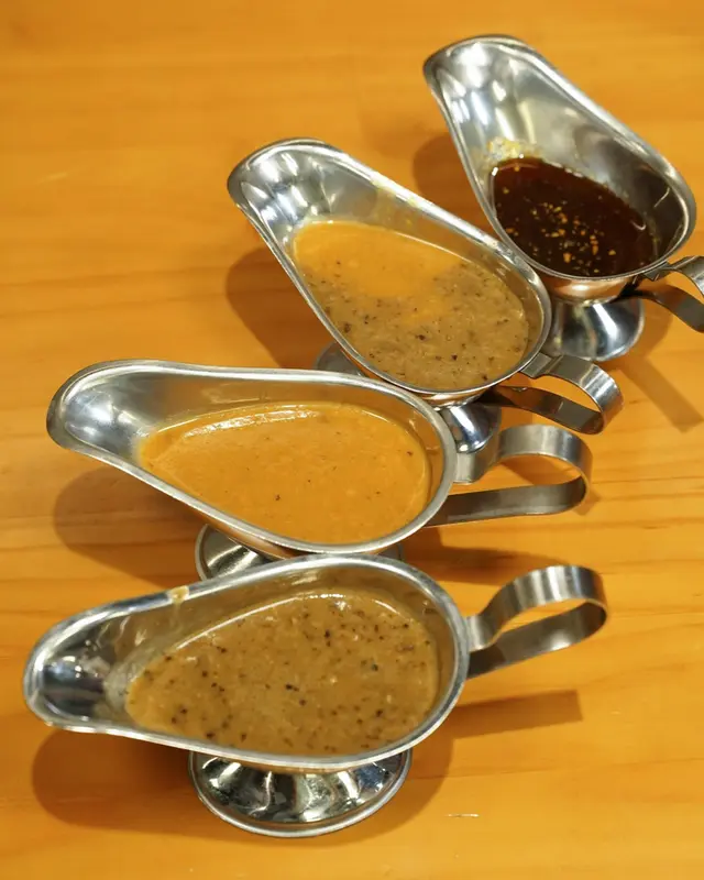 ▼醬汁stand by!日式蒜醬、綜合醬、蘑菇醬、黑胡椒醬。