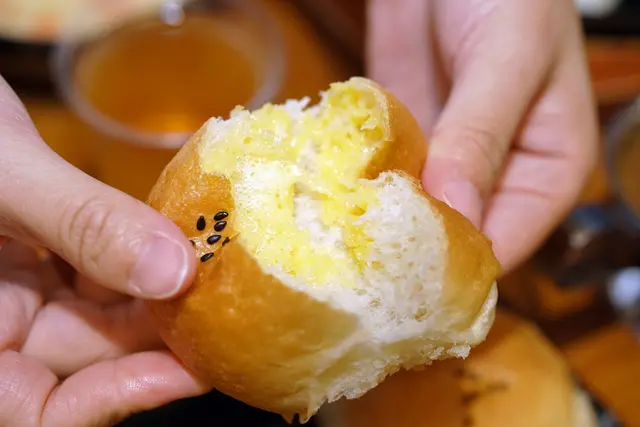 ▼餐包熱騰騰的,外皮酥脆,內餡鬆軟,搭配香甜的奶油,好吃~每人一顆先開開胃!