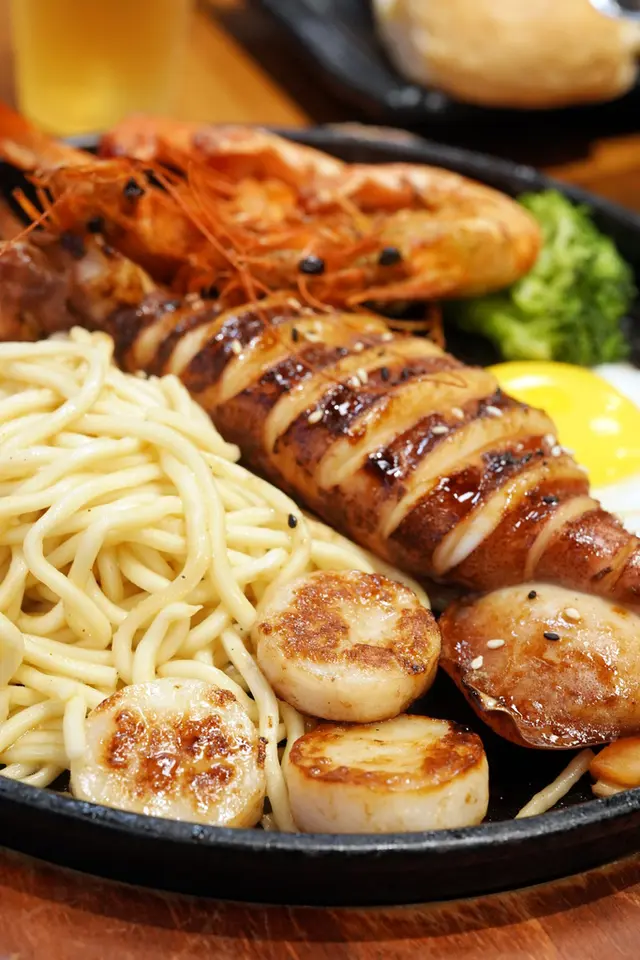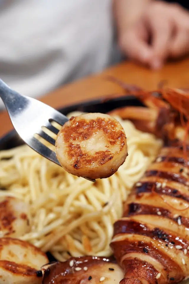 ▼澎湃海鮮拼盤的內容十分豐富,包括三顆干貝、四隻草蝦、一整隻魷魚,完全滿足海鮮控的需求!