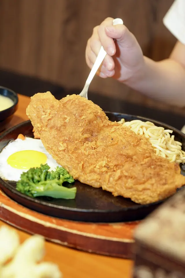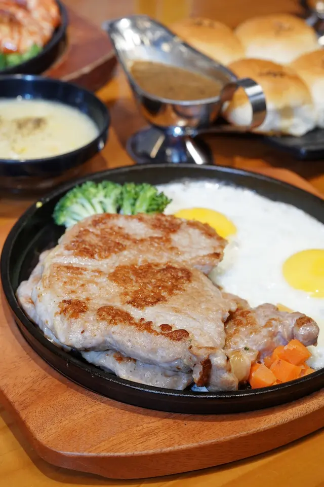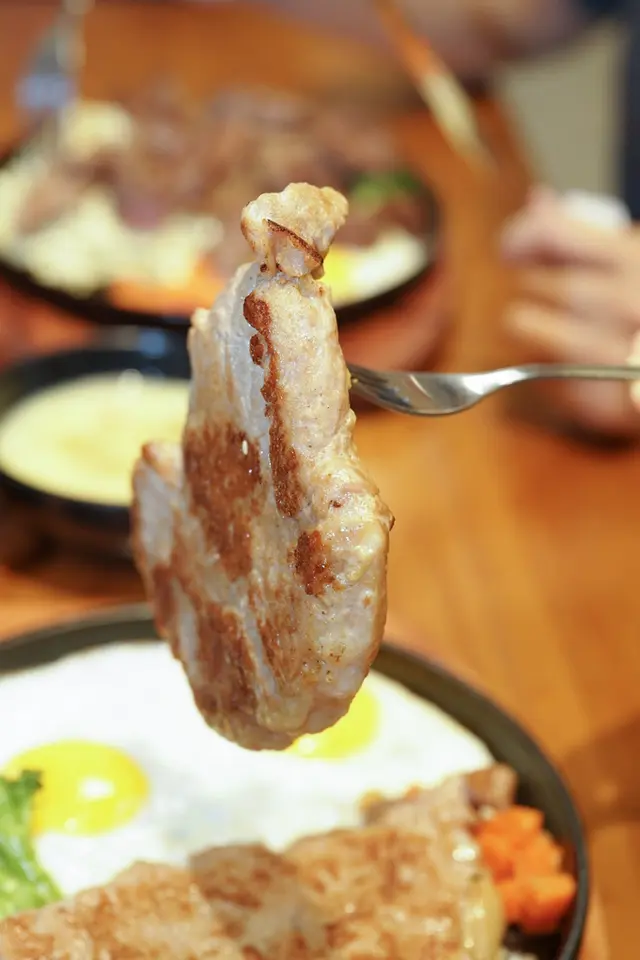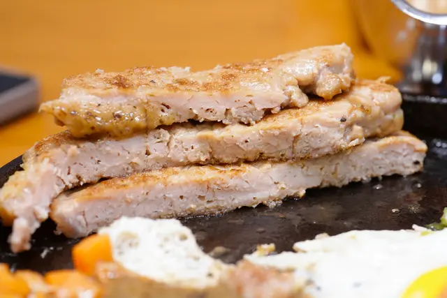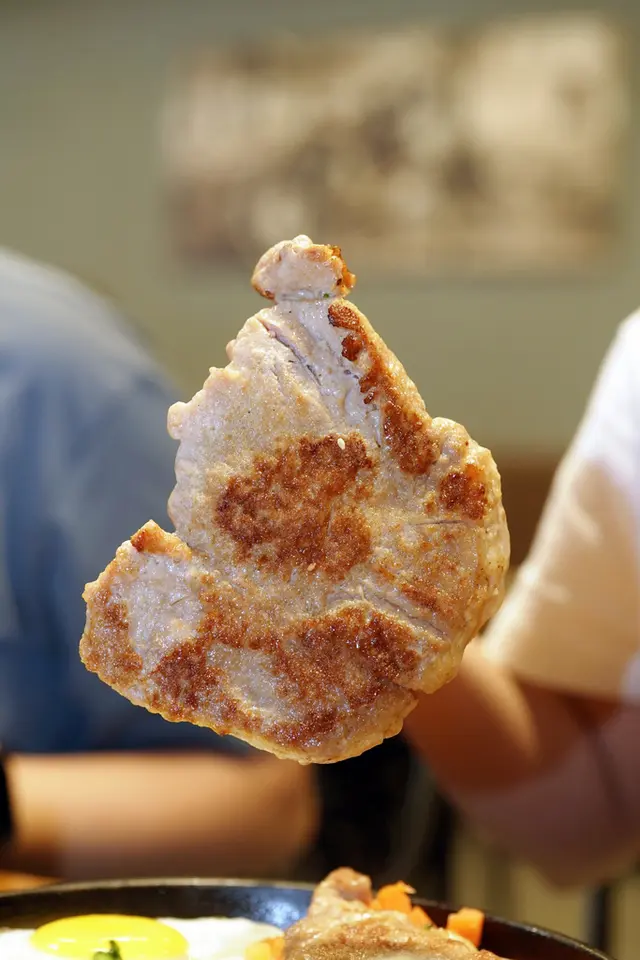 厚厚兩片的里肌豬排,肉質軟嫩不柴,看切面是還帶有水分的~原味吃起來有肉汁、有厚度、沒腥味,很過癮!搭配洋蔥醬或黑胡椒醬也很美味。