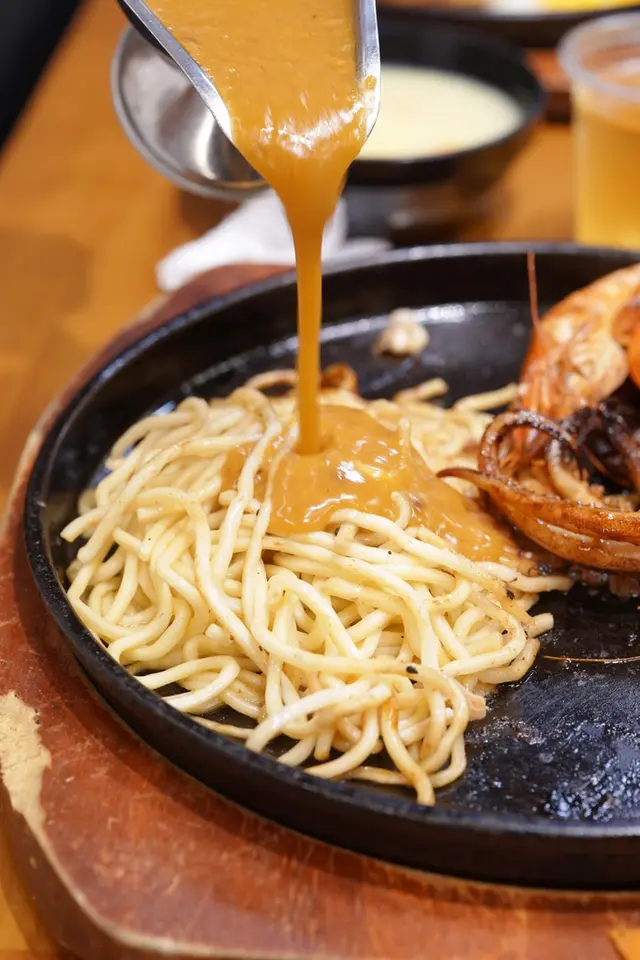 ▼滿滿醬汁淋鐵板麵~醬汁鹹香夠味,麵條滑順有嚼勁。(不想吃麵也可以換成蛋!)