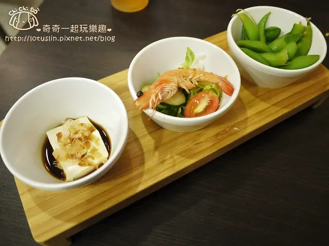 分別是柴魚蛋豆腐、蝦子沙拉與毛豆,