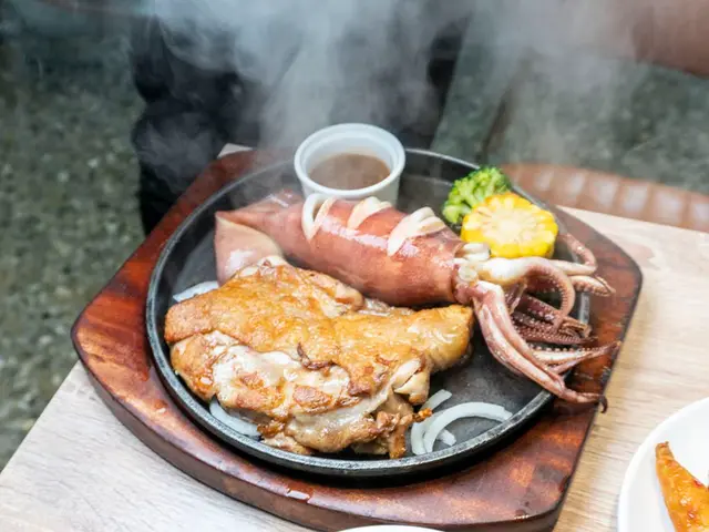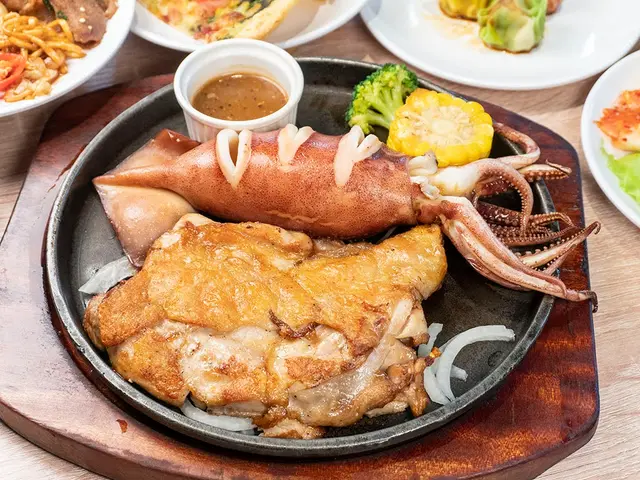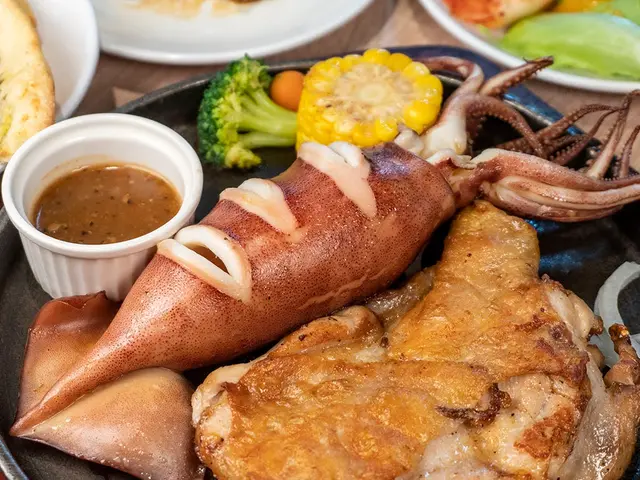 一整隻就是霸氣!塊頭超大,肥滋滋的魷魚吃起來是口感Q彈、海味十足,越嚼越香。搭配沾醬來提提味吃起來就是一個讚👍